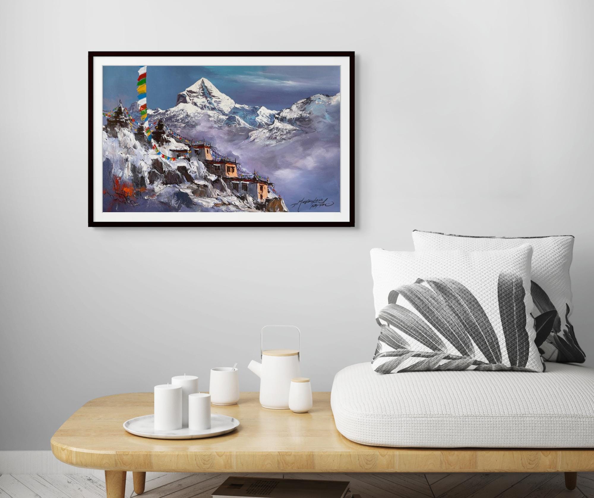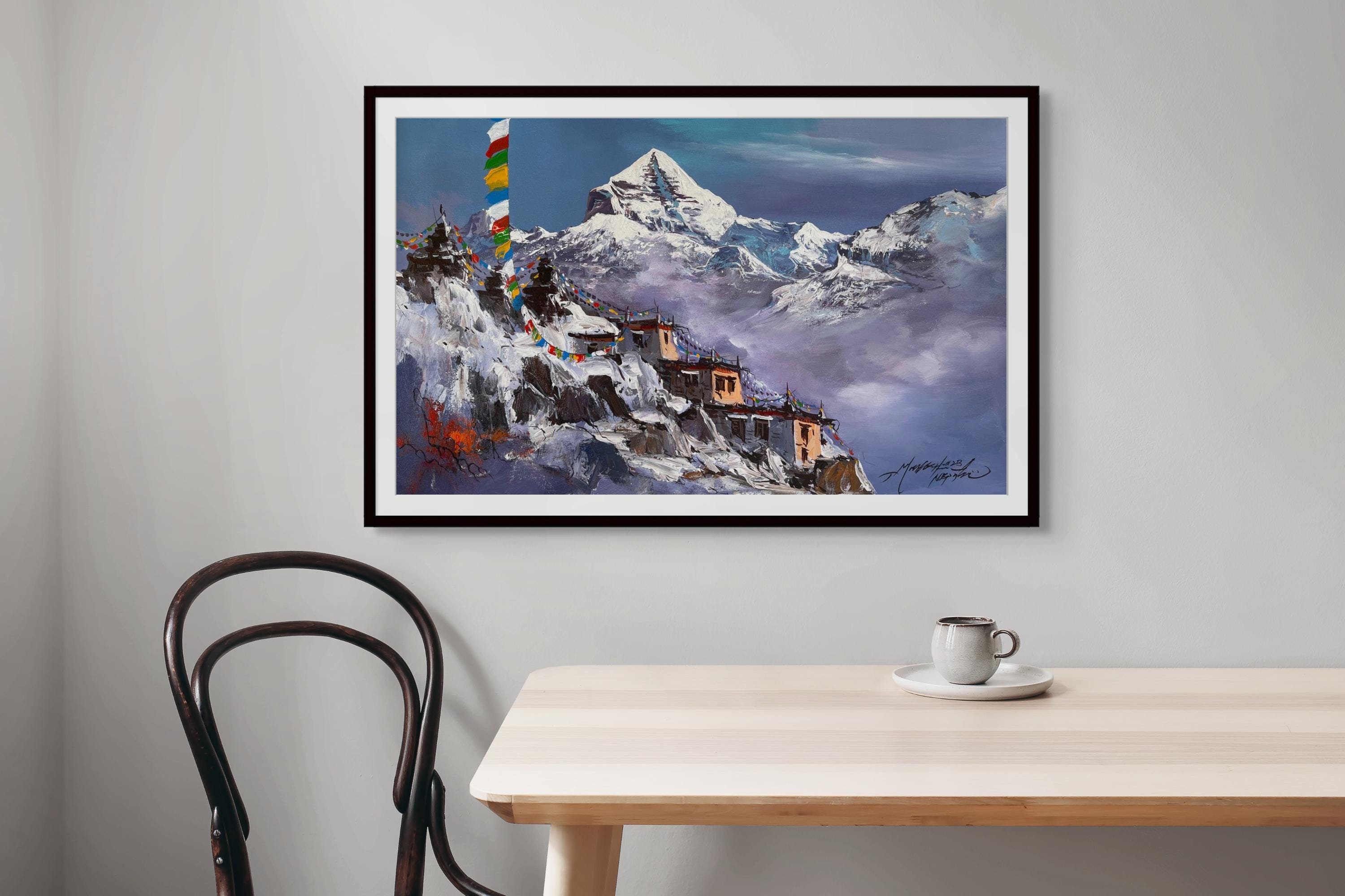 ⦿ Rolled canvas that offers versatility in framing and display. ⦿ Authentic, nature-inspired painting that celebrates the beauty of Mt Kailash. ⦿ One-of-a-kind piece made by the artist Mahesh Acharya, showcasing his signature style.